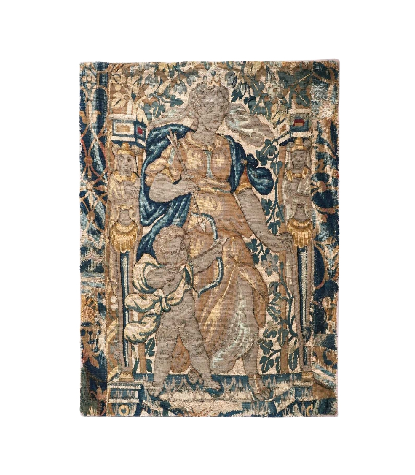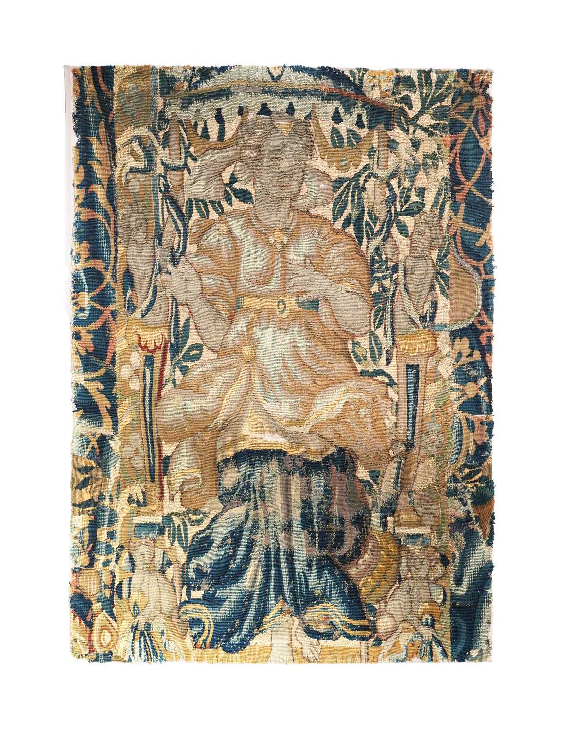 Finely woven, one depicts an allegorical female figure draped in golden robes with a blue mantle, holding a staff, accompanied by a putto with bow and quiver, likely symbolising Love. The scene is set against a rich ground of foliage, with patterned side borders featuring caryatid figures. The palette of soft blues, greens, ochres, and ivory reflects the characteristic natural dyes of the Flemish weaving centres during the 17th century. This fragment, originally part of a larger hanging, demonstrates the refined artistry of the period, where allegorical and mythological subjects were favoured for aristocratic interiors.