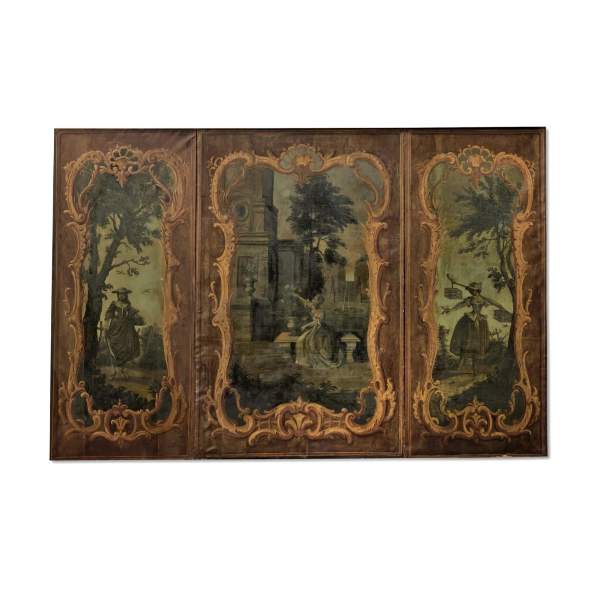 The central panel painted with a scene of an 18th century style lady seated in a courtyard beside an urn of flowers, within an elaborate rococo style acanthus scroll rocaille and shellwork faux gilt frame reserved on a buff ground, flanked by two side panels, one depicting a bird seller, the other a peasant girl holding a basket of fruit, within naturalistic settings, with matching gilt rococo style frames. The canvas has been re-stretched and re-mounted