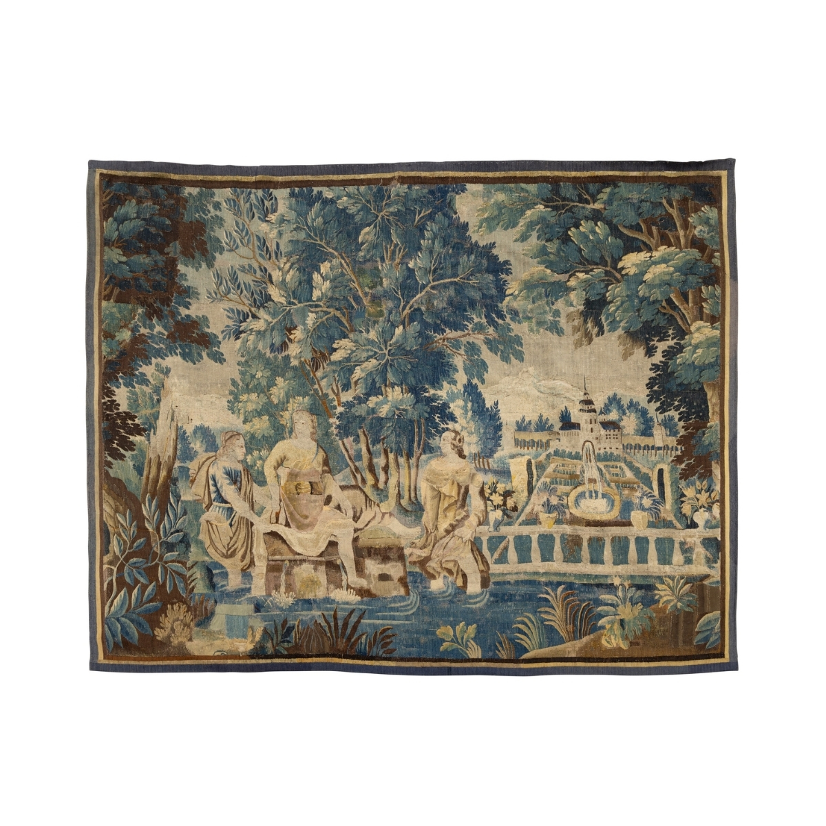 A finely woven, beautiful Verdure tapestry depicting figures in a pool within a pastoral garden setting with a balustrade, fountain and chateau in the background. The piece has a rich palette of blue, green and ochre with stylised foliage and balanced architectural motifs.