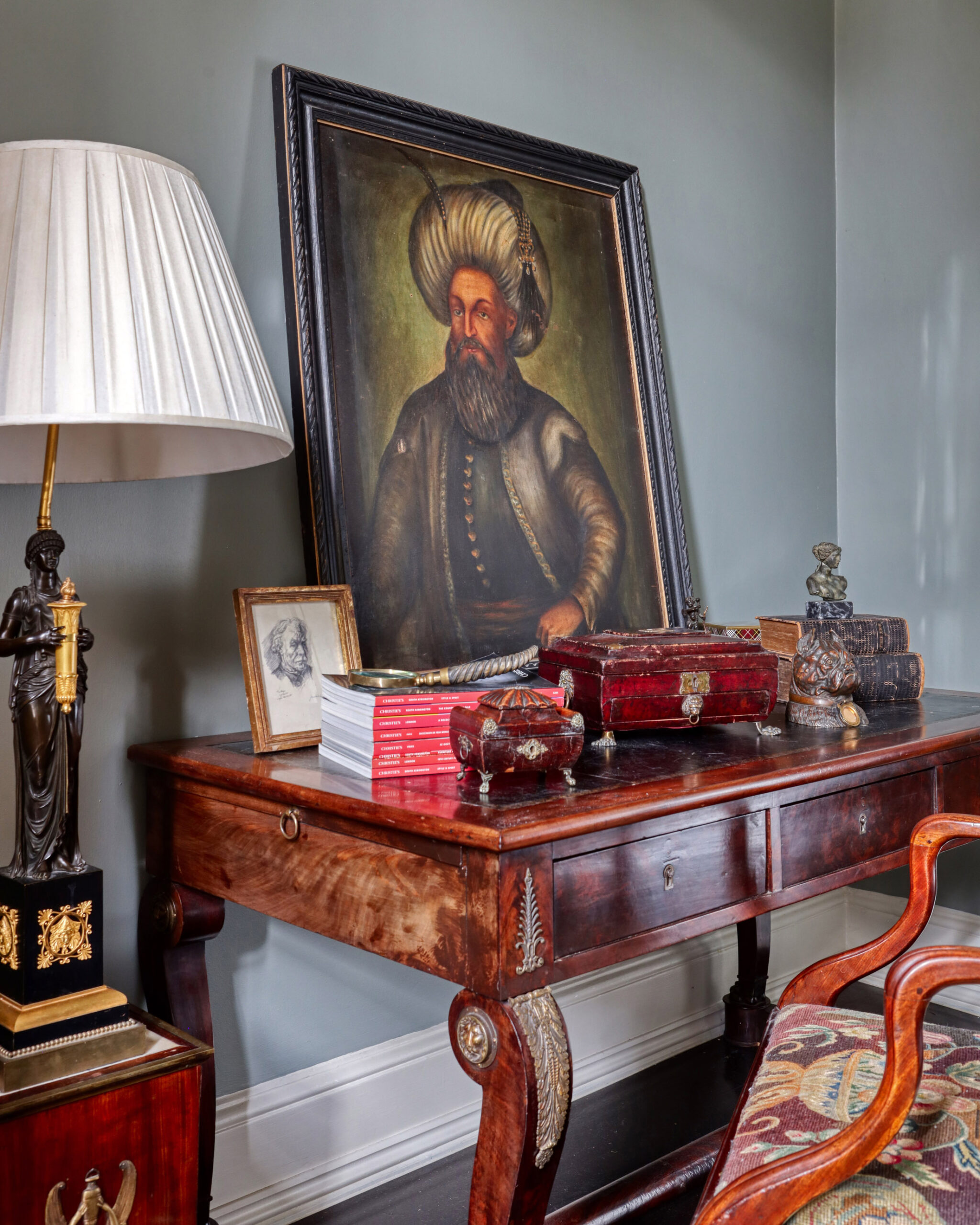 Oil on canvas, three-quarter length portrait of the Sultan with full beard and large turban adorned with jewels, on a dark green ground, in a moulded, ebonised and gilt frame